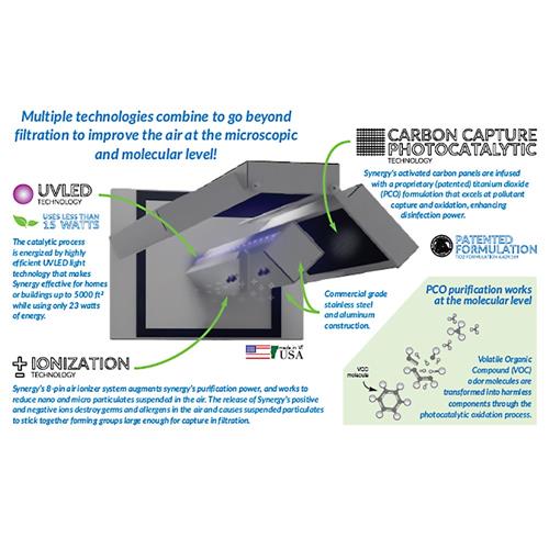 Ultravation® Synergy is a Whole House Air Purifier with MULTIPLE technologies combined in one unit - 3X Photocatalytic Oxidation , Super Efficient (LONG-LASTING) UVLED and 8-PIN Ionization.   Designed for all HVAC Systems up to 5-tons.